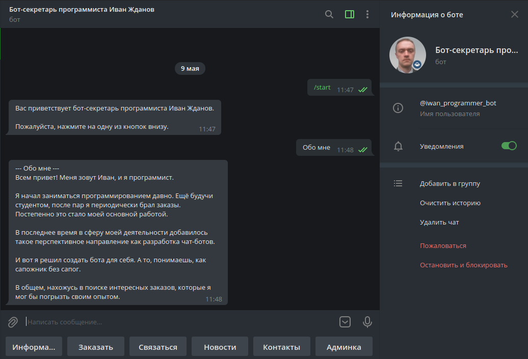 Занимаюсь, в том числе, разработкой чат-ботов.
